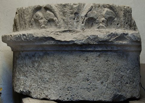 - Glatter Säulenschaft, oben Profilierung mit Flechtband, darüber Blattkranzkapitell.