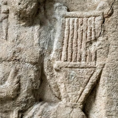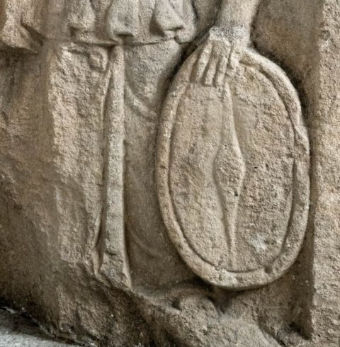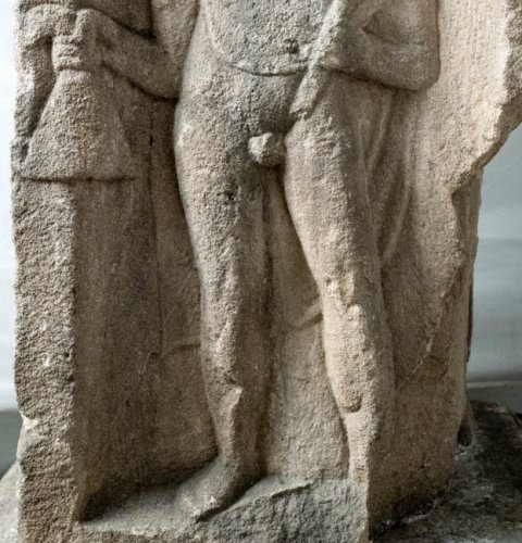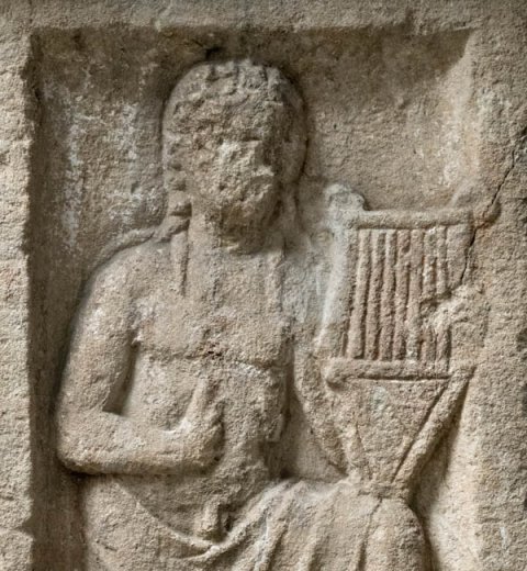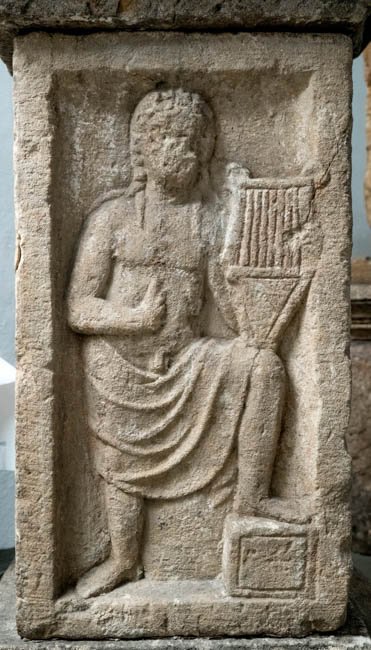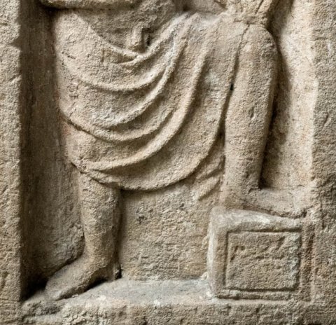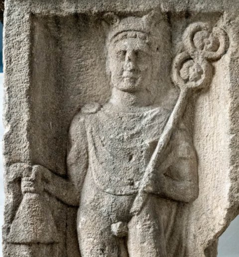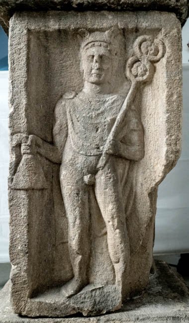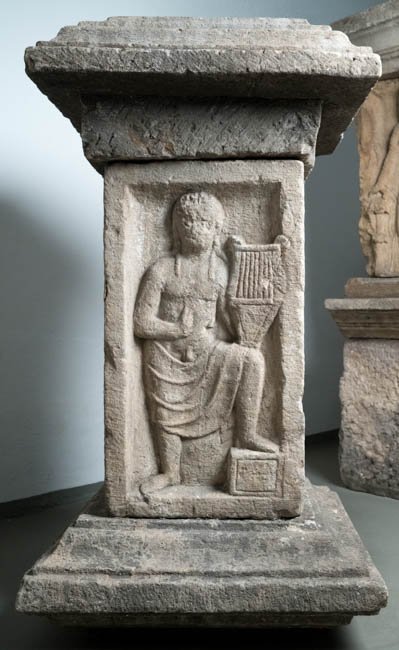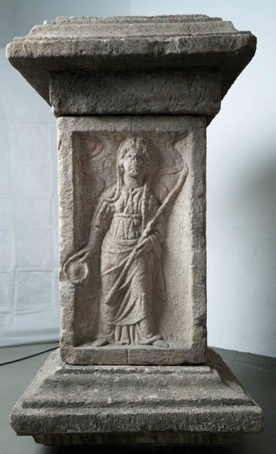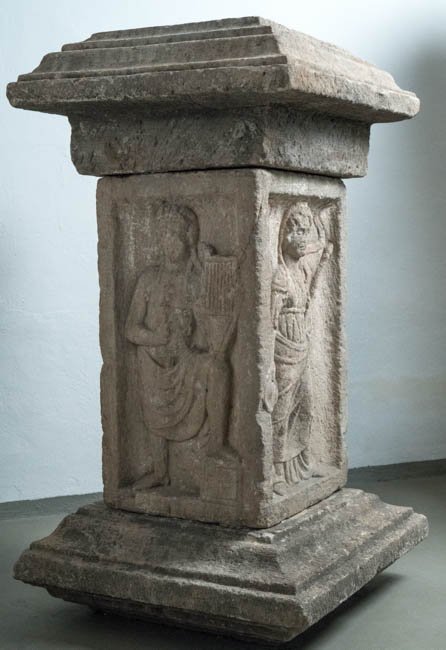 - Mythische Figuren, Musikinstrument: Minerva mit Helm, in der Rechten Lanze, Linke auf dem Schild, über der linken Schulter Eule. Apollo-Grannus mit Kithara, linker Fuß auf Podest gestellt. Sirona-Hygieia mit Schleier, Schale in der Rechten, Szepter in der Linken, über den Schultern Schlangen. Mercur mit Flügelkappe, Mantel, in der Rechten Geldbeutel, in der Linken Caduceus mit Rosetten.