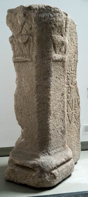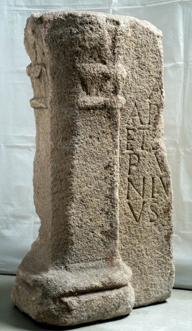 - An den Ecken glatte Pilaster mit Blattkapitell. Auf der Rückseite mythische Figuren: thronende Sirona mit Schleier. Der neben ihr sitzende Apollo ist weggebrochen.