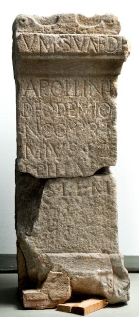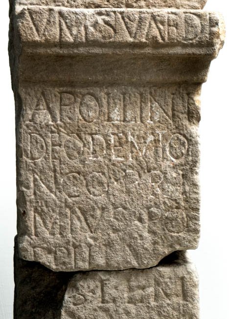 - [C]um sua (a)ede // Apollini / deo Demio/nco Pri/mius Po/ppillus / [v(otum)] s(olvit) l(ibens) l(aetus) m(erito)