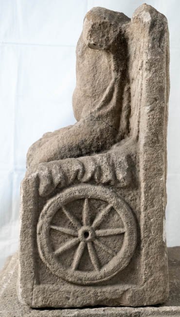 - Mythische Figur: thronender Jupiter mit Mantel um Hüften und über der linken Schulter, über den Thronlehnen Draperie, auf der rechten Thronlehne Adler mit Kranz im Schnabel, auf der linken Rad.