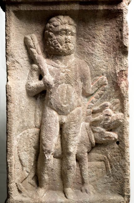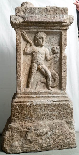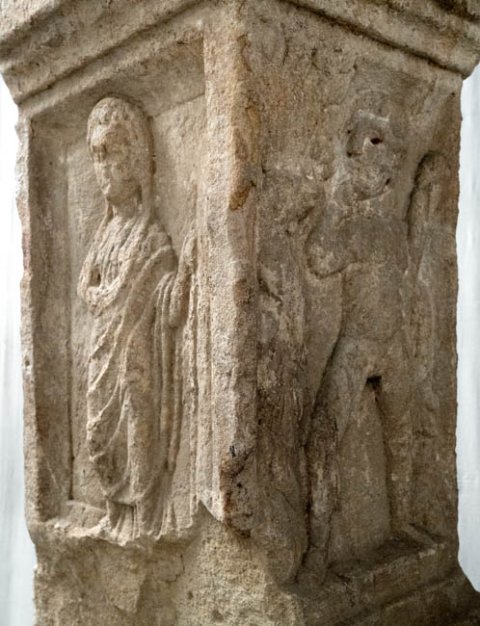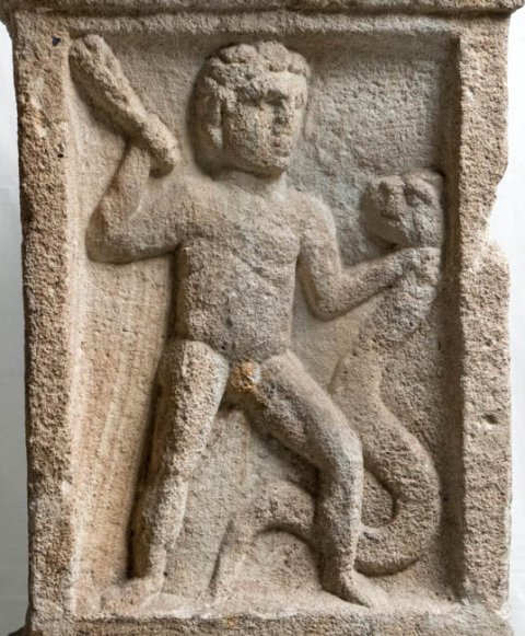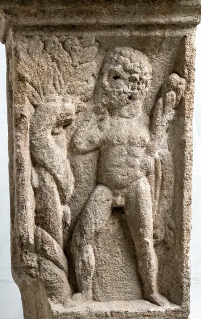 - Mythische Figuren, Mythos: Auf der Oberseite der Basis Reste der Füße des Hercules, einer Baumstammstütze und des Löwenfells erhalten. Auf der Vorderseite Juno mit über den Kopf gezogenem Mantel, in der Linken Szepter. Auf der anderen Seiten Heraklestaten: links Kerbero (Cerberus), auf der Rückseite Hydra, rechts Baum der Hersperiden, um den sich eine Schlange windet.