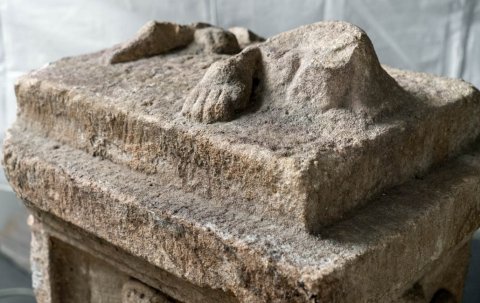 - verwittert, Unterteil der Vorderseite abgeschlagen