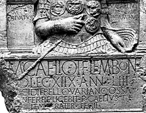 - M(arco) Caelio T(iti) f(ilio) Lem(onia) Bon(onia) / [t(riario)] o(rdini) leg(ionis) XIIX ann(orum) LIII s(emissis) / [ce]cidit bello Variano ossa / [l](ibertorum) [i]nferre licebit P(ublius) Caelius T(iti) f(ilius) / Lem(onia) frater fecit // M(arcus) Caelius / M(arci) l(ibertus) / Privatus // M(arcus) Caelius / M(arci) l(ibertus) / Thiaminus