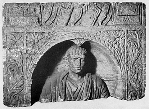 Vorderseite: Muschelnische auf Pfeilern. Am Muschelrand gedrehtes Band, in den Zwickeln über der Muschel Akanthusblätter. Seitliche Rahmenleisten mit Ranken, oben Fries mit Waffen (eckige und ovale Schilde), der sich auf die Nebenseiten fortsetzt.. In der Nische Halbfigur (?) eine Mannes in Tunica und Toga.