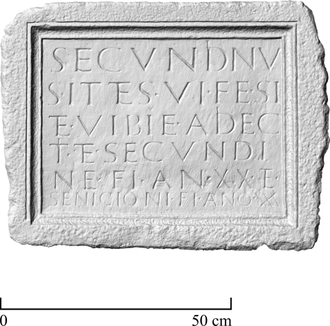 - Secundinu/s Ittes (filius) vi(vus) fe(cit) si(bi) / et Vibi(a)e Adiec/ti (filiae) et Secundi/n(a)e fi(liae) an(norum) XX et / Senicioni fi(lio) an(n)o(rum) XXX