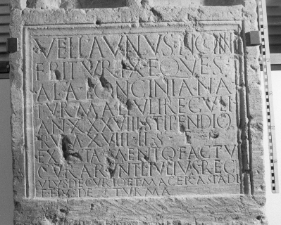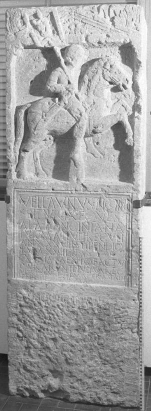 - Vellaunus Nonni / f(ilius) / Biturix eques / ala Longiniana / turma L(uci) Iuli Reguli / an(norum) XXXVIII stipendio/rum XVIII h(ic) s(itus) e(st) / ex testamento factu(m) / cura(ve)runt L(ucius) Iulius Reg/ulus decurio et Macer Aspadi / f(ilius) eiusde(m) turma // L C T