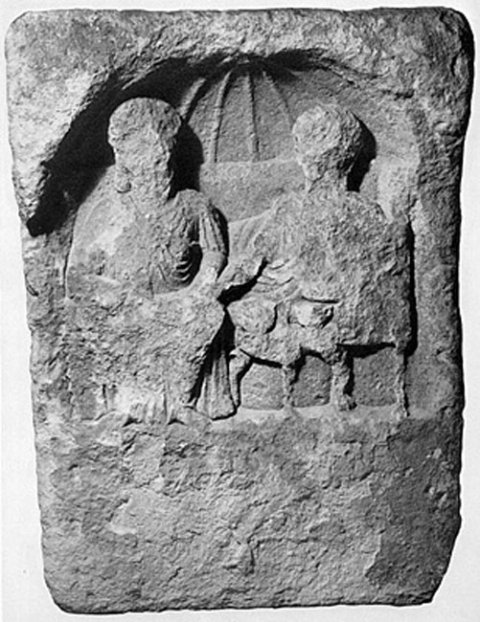 - Hauptbild: in Muschelnische Totenmahl mit auf Kline gelagertem Mann und sitzender Frau. Vorn Tisch mit Gefäßen. Nische mit tordiertem Band gerahmt, in den Zwickeln Blattrosetten. Darunter gerahmtes Schriftfeld und Sockelbild mit Calo und Pferd mit Satteldecke.