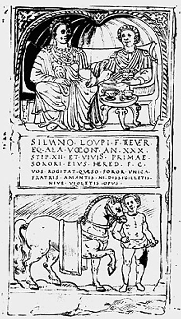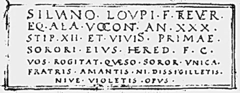 - Silvano Loupi f(ilio) Trever(o) / eq(uiti) ala Vocont(iorum) an(norum) XXX / stip(endiorum) XII et vivis Primae / sorori eius hered(es) f(aciendum) c(uraverunt) / vos rogitat quaeso soror unica / fratris amantis ni dissigilletis / nive violetis opus