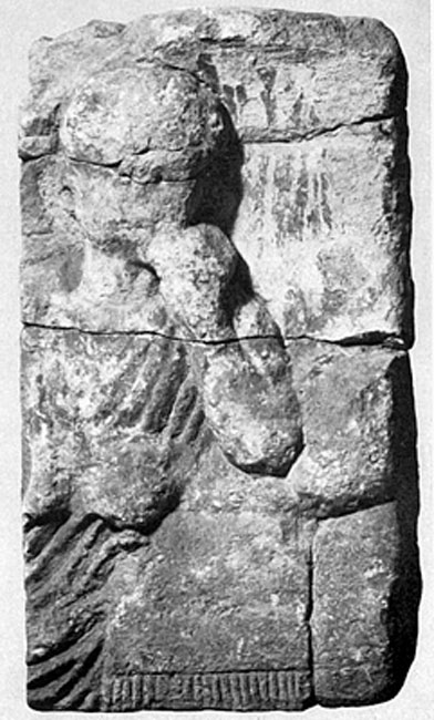 - Rest eines Totenmahls mit gelagertem Mann, in der rechten Hand zweihenkeliges Gefäß.