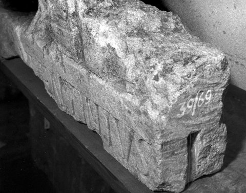 - Rest eines Totenmahlreliefs: Kline mit Tisch (auf Podest) davor, unter diesem Henkelkrug, links Füße eines Dieners.