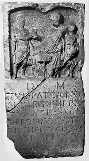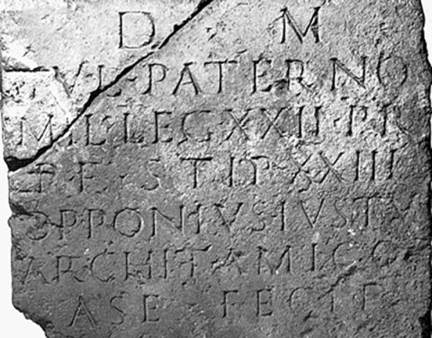 - D(is) M(anibus) / Iul(io) Paterno / mil(iti) leg(ionis) XXII Pr(imigeniae) / P(iae) F(idelis) stip(endiorum) XXXIII / Opponius Iustus / archit(ectus) amico / a se fecit