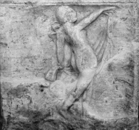 - Mythische Figur. Unter dem gerahmten Schriftfeld eingetieftes Sockelbild mit tanzender nackter Mänade in Rückenansicht. Im Haar Band, die Hände halten eine Schleier vor dem Leib.