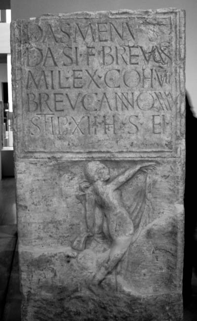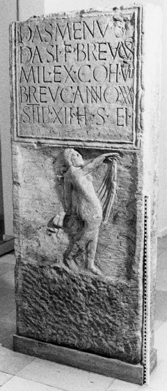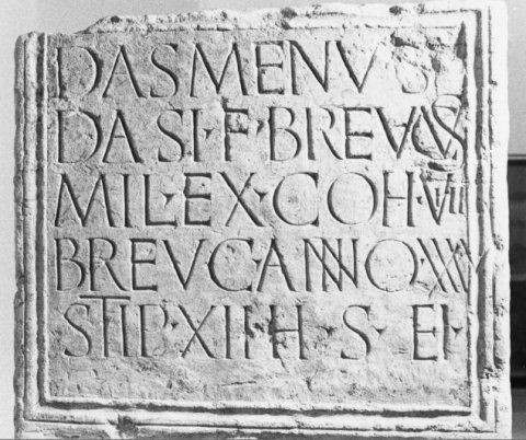 - Dasmenus / Dasi f(ilius) Breucus / mil(es) ex coh(orte) VIII / Breuc(orum) anno(rum) XXXV / stip(endiorum) XII h(ic) s(itus) e(st)