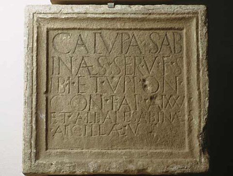 - Calupa Sab/inaes ser(va) v(iva) f(ecit) s/ibi et Upponi / con(iugi) kar(issimo) an(norum) XXV / et Alban(a)e Sabinaes (!) / ancillae v(ivae)