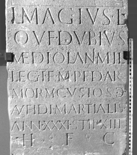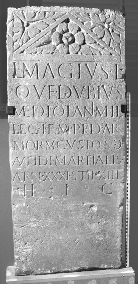 - L(ucius) Magius L(uci) (!) / Ouf(entina) Dubius / Mediolani mil(es) / leg(ionis) I F(laviae) M(inerviae) P(iae) F(idelis) D(omitianae) ar/morum custos |(centuria) / Aufidi Martialis / ann(orum) XXXI stip(endiorum) XIII / h(eres) f(aciendum) c(uravit)