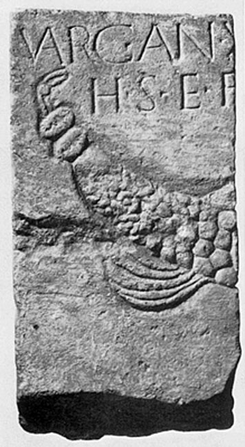 - Unterhalb der rahmenlosen Inschrift Girlande aus Blüten und Früchten.