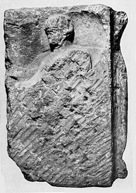 - Totenmahl: Rest einer Muschelnische, darin Umrisse eines gelagerten bärtigen Mannes