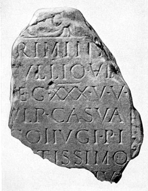 - [D(is) M(anibus)] / [P]rimini[o] / Tullio ve[t(erano)] / leg(ionis) XXX U(lpiae) V(ictricis) / Ulp(ia) Casua / co<n=I>iugi pi/[en]tissimo / [et sibi v]iva / [fecit]