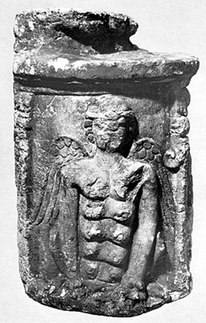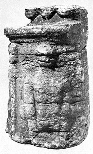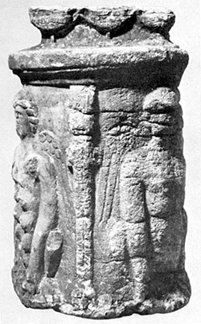 - Runde dreifüßige Tischchen, auf denen Gefäße stehen. Stein zwischen den Tischbeinen (mit Löwenpranken) ist stehen gelassen, darauf in Relief je zwei frontal hockende Sphingen.