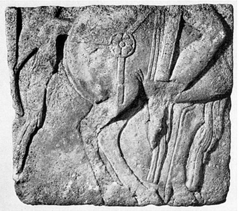 a) Block eines Reiterreliefs (Schlachtszene ?) mit Resten von vier hintereinander gestaffelten Pferden. Auf dem vorderen Pferd noch rechtes Bein eines Soldaten mit Schwertscheide erhalten. Nebenseiten auf Anschluss gearbeitet. Rekonstruierte Länge des Reliefs ca. 2,60 m.