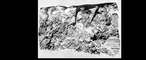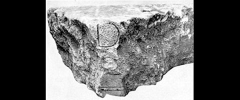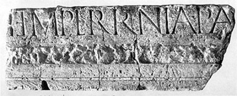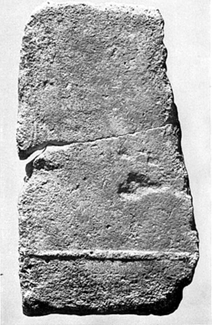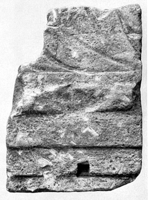 e) Block mit geglätteter Vorderseite, darauf dünner Rundstab. Links auf Anschluss gearbeitet, sonst gebrochen. - Inschrift