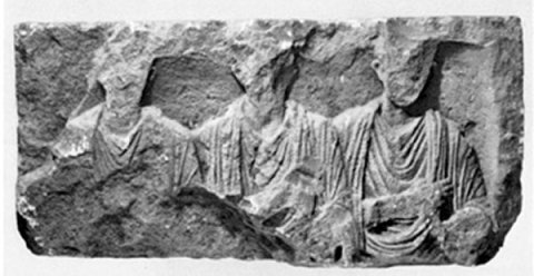 - Oben Muschelnische mit zwei Brustbildern (Ehepaar, links Mann, rechts Frau ?). Am Muschelrand tordiertes Band, in den Zwickeln über dem Bogen Blattrosetten. Unterhalb der Nische Schriftfeld, darunter Rechtecknische mit Halbfiguren (?) von drei Männern in Tunica und Toga, in der Linken Rolle (volumen). Auf den Nebenseiten oben Peltenschild mit Blattornament, darunter Lorbeerbaum.