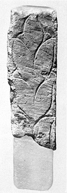 - Mit Ritzlinien gerahmter eingeschriebener Giebel mit Blattmaske, über den Giebelschrägen Blätter. Schriftfeld rahmenlos.