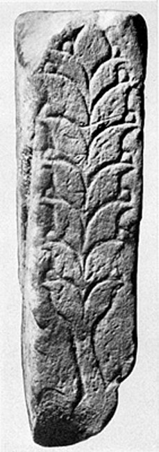 - Inschrift seitlich von Ritzlinien gerahmt, unten rechteckig eingetieftes Bildfeld mit Girlande, auf der ein Pfau sitzt. Auf den Nebenseiten je ein Lorbeerbaum.