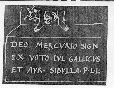 - Deo Mercurio sign(um) / ex voto Iul(ius) Gallicus / et Aur(elia) Sibulla p(osuerunt) l(ibentes) l(aeti)