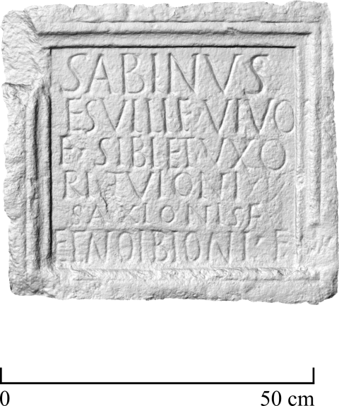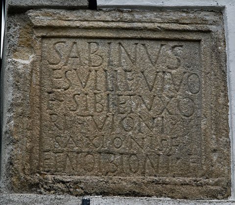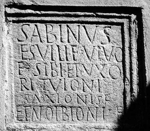- Sabinus / Esulli f(ilius) vivos (!) / f(ecit) sibi et uxo/ri Tuioni / Saxionis f(iliae) / et Noibioni f(ilio) an(norum) X