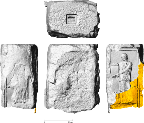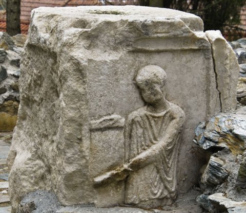 - Gerahmte Inschrift auf der Vorderseite zerstört. Auf der rechten Nebenseite Diener (Librarius - Scriba mit volumen), auf der linken Spuren einer Dienerin.