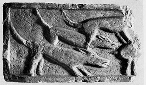 - Jagdszene: drei hinter- und übereinander gestaffelte Hunde nach rechts, an der Bruchkante Hinterteil des Beutetieres.