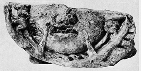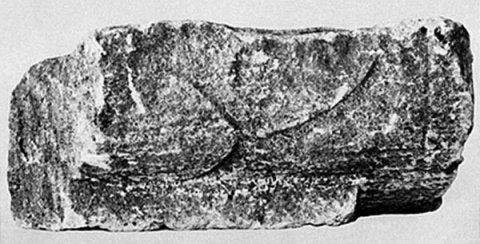 - Rechte Volute einer Altarbekrönung (pulvinus), vorn Gorgoneion, auf der Längsseite Schuppenmuster.