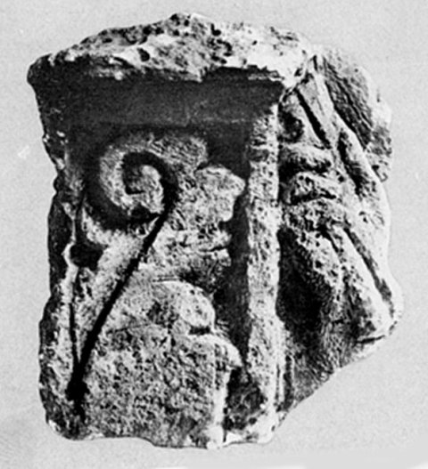 - Rechts Rest eines Bildfeldes mit erhobener Hand, die längliches Objekt hält. Links anschließend mit einer schmalen Leiste gerahmter Pilaster mit großem Akanthusblatt, oben profiliertes Gesims.