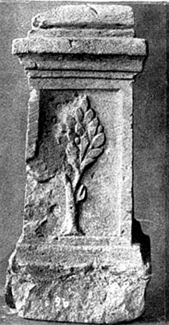 - Volutenpolster (pulvini). Auf der rechten Nebenseite Baum in gerahmtem Bildfeld.