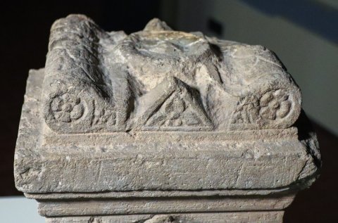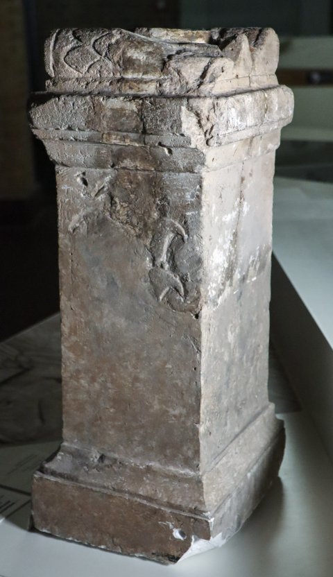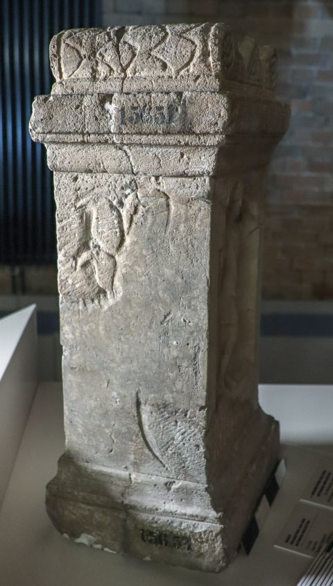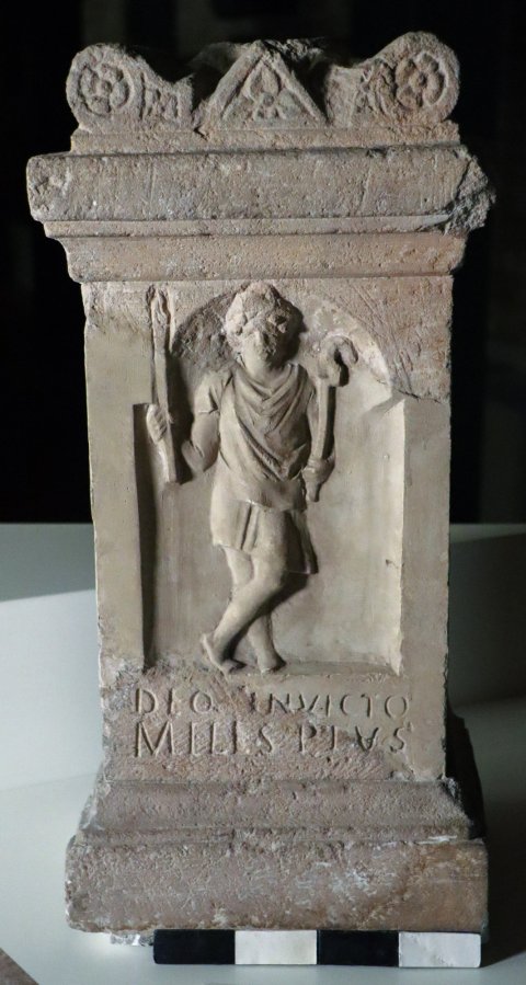 - Mythische Figur: auf der Vorderseite über der rahmenlosen Inschrift eingetiefte Bogennische. darin Cautes mit phrygischer Mütze und erhobener Fackel. Altarbekrönung mit Volutenpolster (pulvini) mit Rosetten, dazwischen kleiner Giebel mit Rosette.