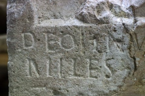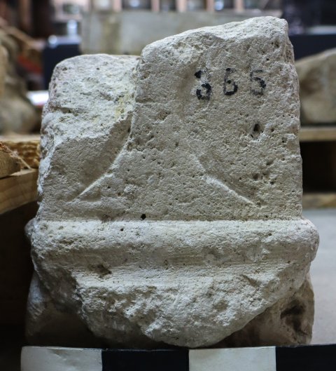 - Mythische Figur: auf der Vorderseite über der rahmenlosen Inschrift eingetiefte Bildnische. darin die gekreuzten Füße des Cautopates (oder Cautes ?). Auf der linken Nebenseite Umrisse eines Baums.