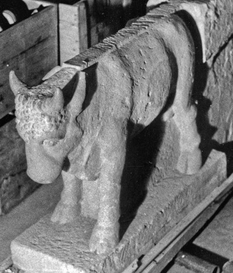 - Stehender Stier auf flacher Basisplatte, am hinteren Ende geglätteter Steinblock, entlang des Rückens eckiger Grat, zwischen den Beinen Stein als Stütze stehen gelassen. Sieben mitgefundene Inschriftfragmente gehörten zu einer Platte, die vermutlich von beiden Stieren getragen wurde.