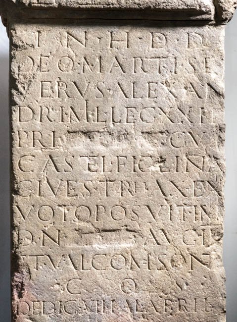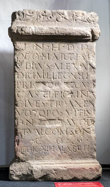 - In h(onorem) d(omus) d(ivinae) / Deo Marti Se/verus Alexan/dri mil(es) leg(ionis) XXII / Pri(migeniae) [[Anton(inianae) p(iae) f(idelis)]] cus(tos) / Castel(li) figlina(rum) / civ<i=E>s Trhax(!) ex / voto posuit Im[p(eratore)] / d(omino) n(ostro) [[Anton(ino)]] Aug(usto) II[I] / et Val(erio) Comasont[e](!) / co(n)s(ulibus) / dedic(avit) VII Kal(endas) April(es)