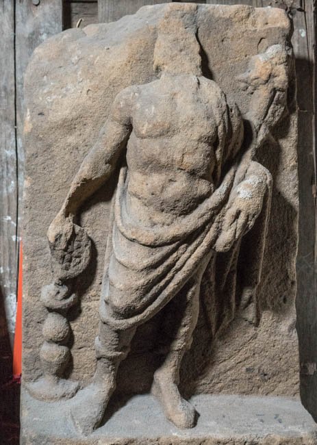 - Auf vorspringender Standleiste, deren Vorderseite die Inschrift trägt, stehender Genius, Mantel um Hüften und linken Arm. Die Rechte hält eine Schale über einem balusterförmigen Altar, im linken Arm Füllhorn mit Früchten.