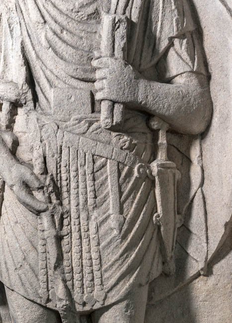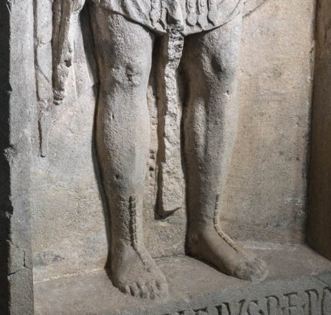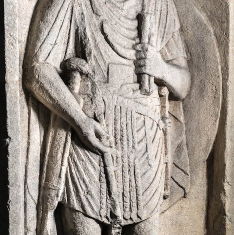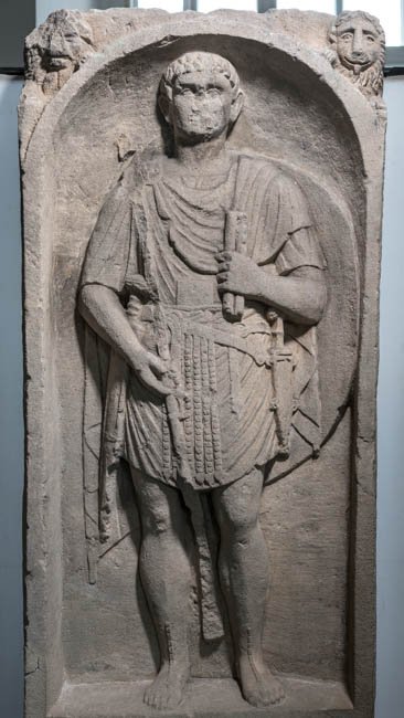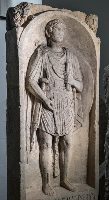 - In einfach gerahmter Bogennische mit Löwenakroteren stehende Ganzfigur eines Soldaten in Sandalen, kurzer Tunica, Sagum mit Metallbeschwerern am Saum. Waffen: Gürtel mit Dolch an der linken, Schwert an der rechten Hüfte. Im Gürtel steckt eckige Platte (Schreibtafel ?). In der rechten Hand Stab (hasta mit Wurfschlinge ?), in der linken Rolle (volumen). Hinter der linken Schulter hängender Ovalschild.
