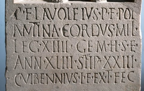 - P(ublius) Flavoleius P(ubli) f(ilius) Pol(lia) / Mutina Cordus mil(es) / leg(ionis) XIIII Gem(inae) h(ic) s(itus) e(st) / ann(orum) XLIII stip(endiorum) XXIII / C(aius) Vibennius L(uci) f(ilius) ex t(estamento) fec(it)