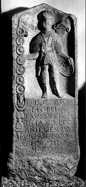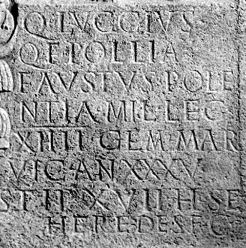 - Q(uintus) Luccius / Q(uinti) f(ilius) Pollia / Faustus Pol(l)e/ntia mil(es) leg(ionis) / XIIII Gem(inae) Mar(tiae) / Vic(tricis) an(norum) XXXV / stip(endiorum) XVII h(ic) s(itus) e(st) / heredes f(aciendum) c(uraverunt)