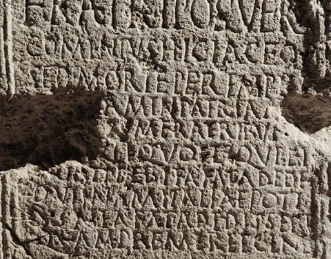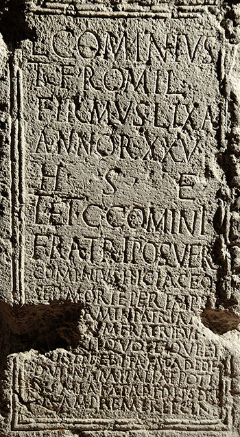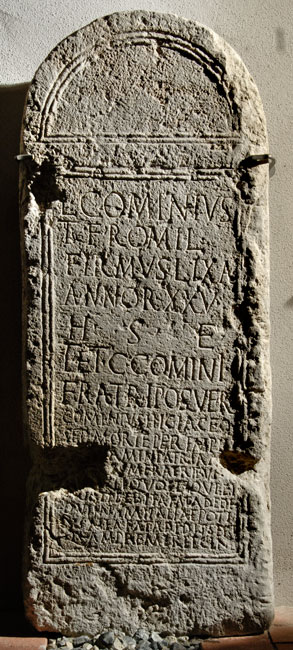 - L(ucius) Cominius / T(iti) f(ilius) Romil(ia) / Firmus lixa / annor(um) XXV / h(ic) s(itus) e(st) / T(itus) et C(aius) Comini / fratri posuerunt / Cominius hic iaceo / sed morte preemptu[s] / [optab]am in patriam [de]/[hinc] cum fratribus / [--- ve]rti quos liqui et / morti debita fata dedi / o utinam Italiae poti/us mea fata dedissent / quam premeret cine(res barbara terra meos)