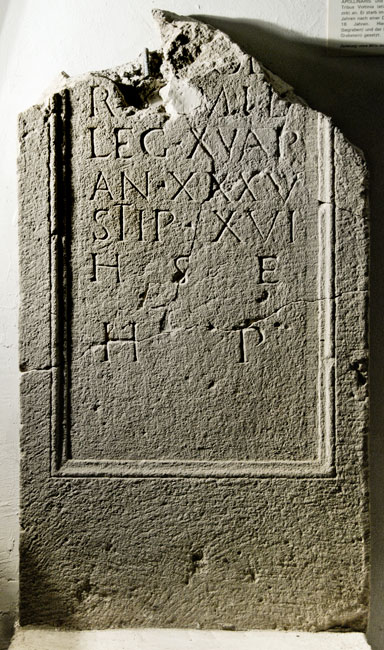 - ---] Vol[t](inia) / R[eis] mil(es) / leg(ionis) XV Ap(ollinaris) / an(norum) XXXV / stip(endiorum) XVI / h(ic) s(itus) e(st) / h(eres) p(osuit)