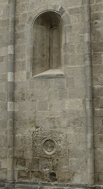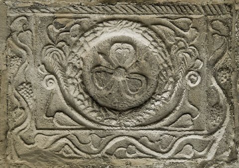 - Rechteckiges Bildfeld mit Kranz mit Tänien, im Inneren dreiblättrige Blüte, oberhalb Efeuranken. Auf den seitlichen und unteren Rahmenleisten Ranken mit Weintrauben und Efeublättern. Oben tordierte Leiste.