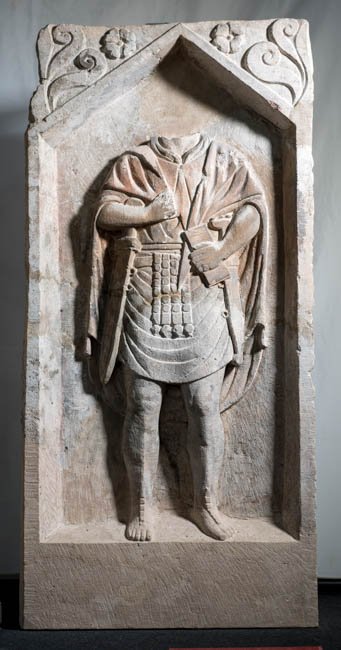 - Einfach gerahmte Bildnische mit offenem Giebel, über den Giebelschrägen Halbpalmetten und Rosetten. Stehende Ganzfigur eines Soldaten in kurzer Tunica, Paenula und Halstuch, vorn am Gürtel vier Riemen mit Metallbeschlägen. Waffen: Gürtel mit Schwert und Dolch. In der linken Hand (mit Fingerring) Schreibtafel (Diptychon).
