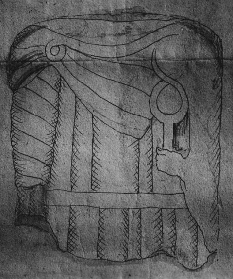 - Mythische Figur: frontal stehender Mercur in gegürtetem Ärmelgewand und auf der rechten Schulter mit Fibel befestigtem Mantel. In der Linken Caduceus.