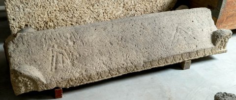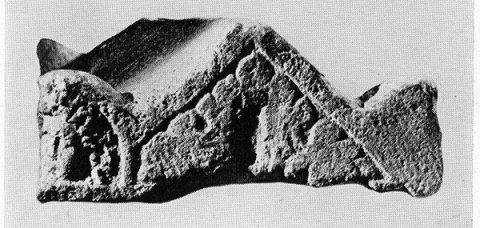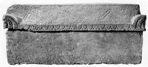 - Undekorierter Kasten ohne Inschrift. Am vorderen Deckelrand Schuppenreihe, auf dem Deckel Werkzeuge (Ritzzeichnung: Beil, Lot). Eckakrotere der Vorderseite: Masken mit langen Locken. Rechtes Giebelfel des Deckels mit Blattornament.